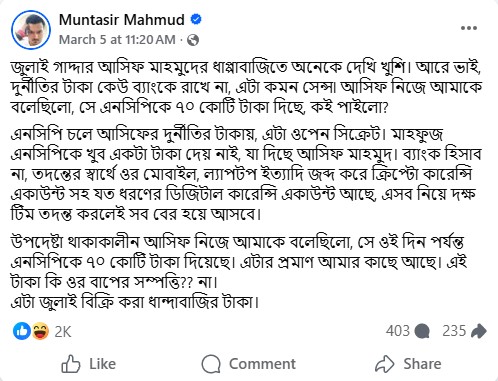 পোস্টে মুনতাসির মাহমুদ দাবি করেন, উপদেষ্টা থাকাকালীন এক পর্যায়ে আসিফ মাহমুদ তাকে জানান যে সে সময় পর্যন্ত তিনি এনসিপিকে ৭০ কোটি টাকা দিয়েছেন। এ দাবির পক্ষে তার কাছে প্রমাণ রয়েছে বলেও তিনি উল্লেখ করেন।